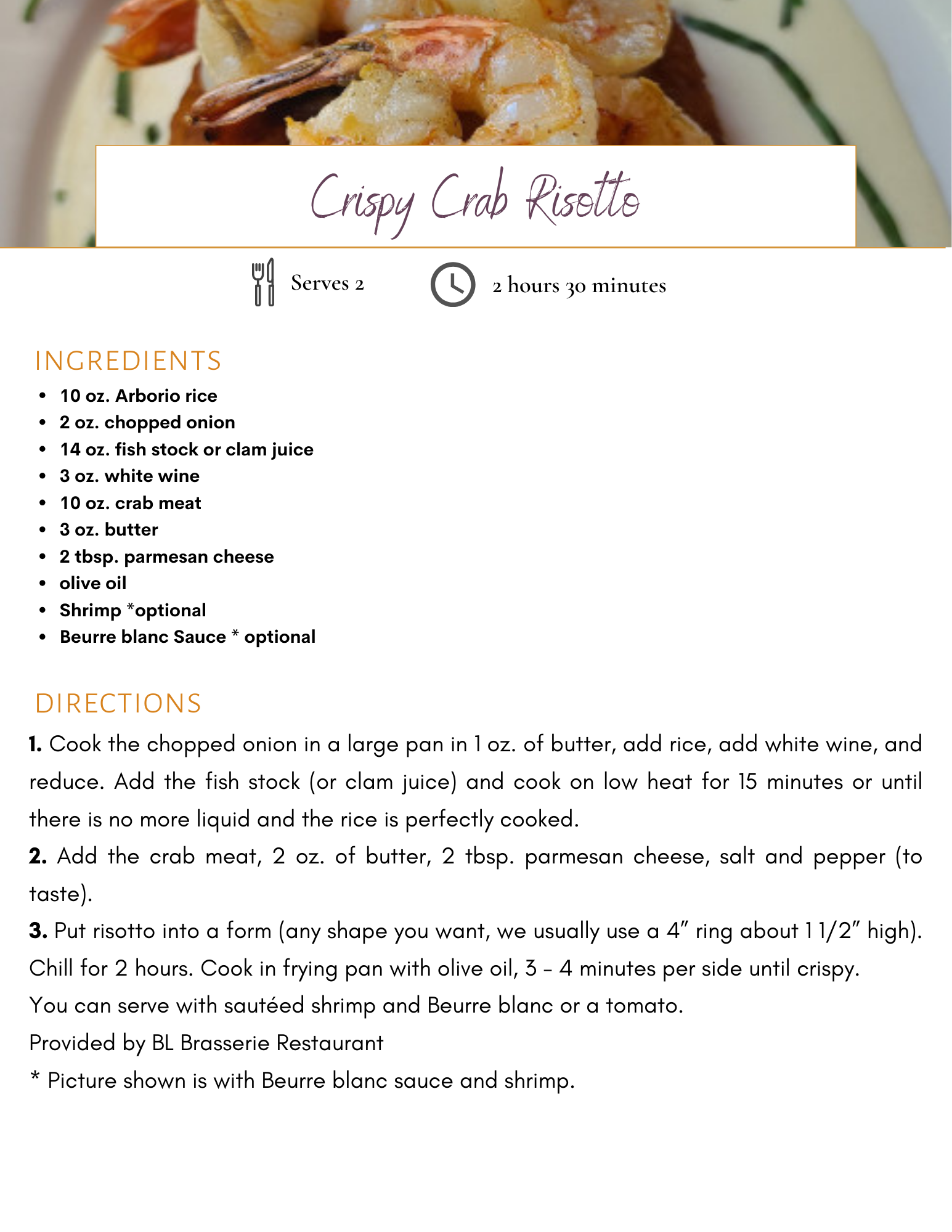 Cook the chopped onion in a large pan in 1 oz. of butter, add rice, add white wine, and reduce. Add the fish stock (or clam juice) and cook on low heat for 15 minutes or until there is no more liquid and the rice is perfectly cooked .Add the crab meat, 2 oz. of butter, 2 tbsp. parmesan cheese, salt and pepper (to taste). Put risotto into a form (any shape you want, we usually use a 4” ring about 1 1/2” high). Chill for 2 hours. Cook in frying pan with olive oil, 3 - 4 minutes per side until crispy. You can serve with sautéed shrimp and Beurre blanc or a tomato.