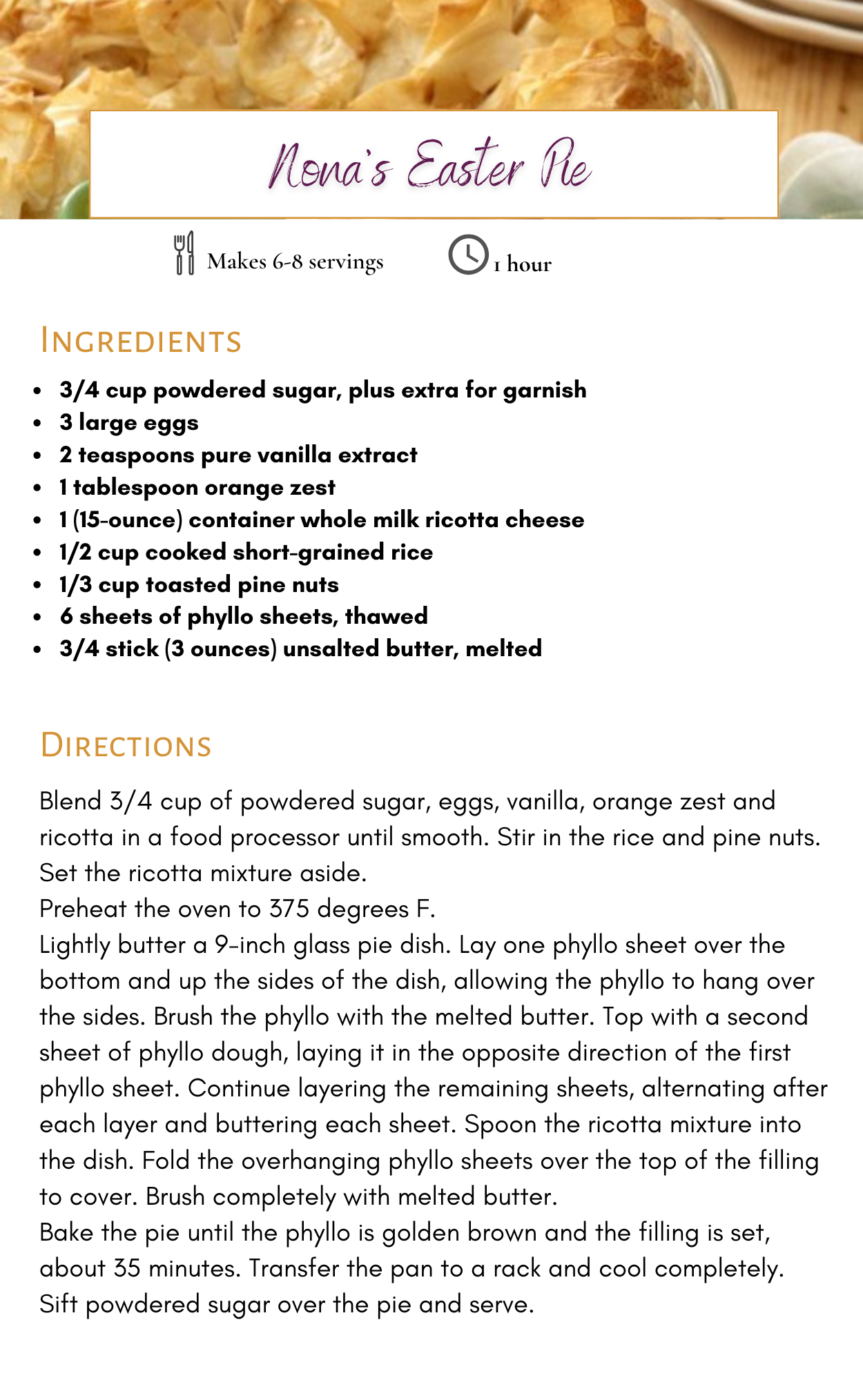 Blend 3/4 cup of powdered sugar, eggs, vanilla, orange zest and ricotta in a food processor until smooth. Stir in the rice and pine nuts. Set the ricotta mixture aside.